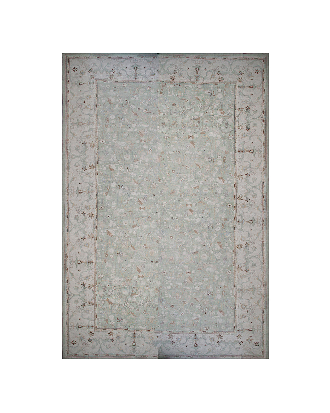 The soft green background not only adds a touch of sophistication but also complements the intricate design, creating a harmonious visual impact. Crafted with high-quality wool and adorned with silk highlights, this rug epitomizes luxury and refinement.