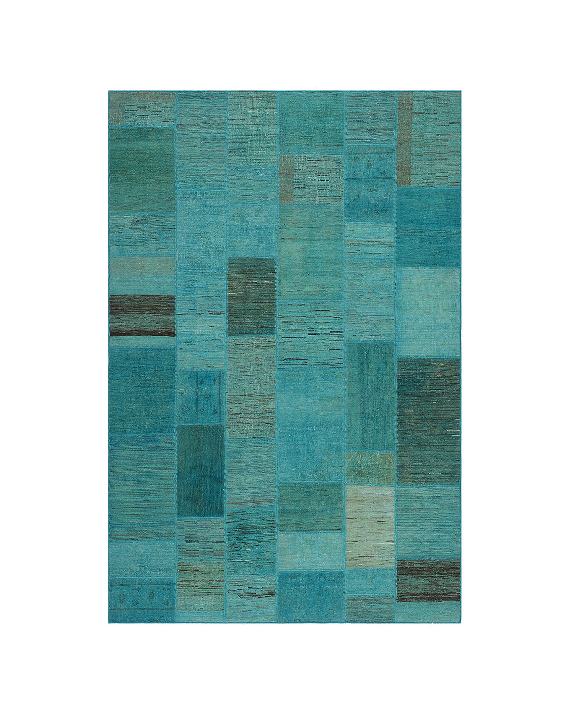 Our stunning Turquoise Blue Overdyed Patchwork Rug, a true work of art. This hand-knotted masterpiece is crafted from meticulously repurposed rugs, creating a unique patchwork design that exudes character and charm. The striking turquoise blue hue adds a vibrant pop of color to any room, instantly transforming your space. Made from high-quality wool, it's not just beautiful but also soft to the touch. Elevate your home decor with this one-of-a-kind rug that's sure to be a conversation piece.