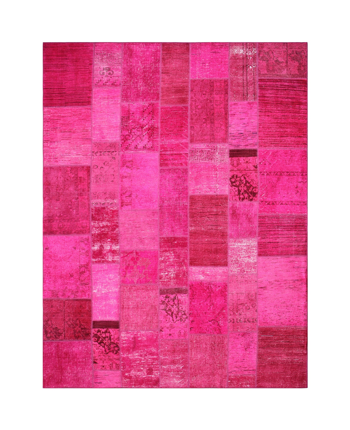 Our stunning hot pink Overdyed Patchwork Rug, a true work of art. This hand-knotted masterpiece is crafted from meticulously repurposed rugs, creating a unique patchwork design that exudes character and charm. The striking pink hue adds a vibrant pop of color to any room, instantly transforming your space. Made from high-quality wool, it's not just beautiful but also soft to the touch. Elevate your home decor with this one-of-a-kind rug that's sure to be a conversation piece.