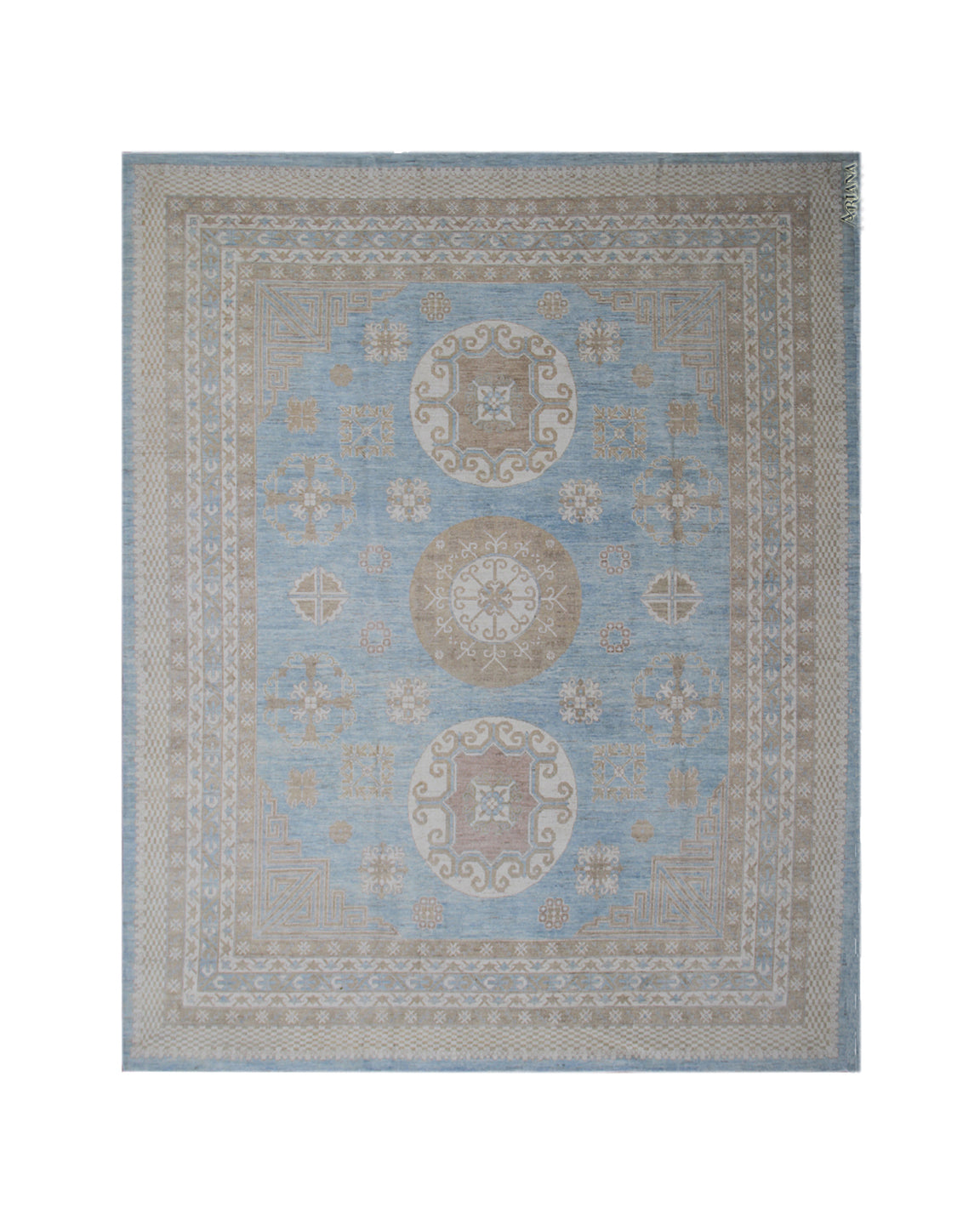 This elegant Ariana Samarkand rug features a refined central medallion set against a serene blue background, beautifully balanced with soft ivory and warm camel tones. Inspired by classic Samarkand designs, the composition blends geometric and floral elements, creating a timeless look that feels both sophisticated and inviting.