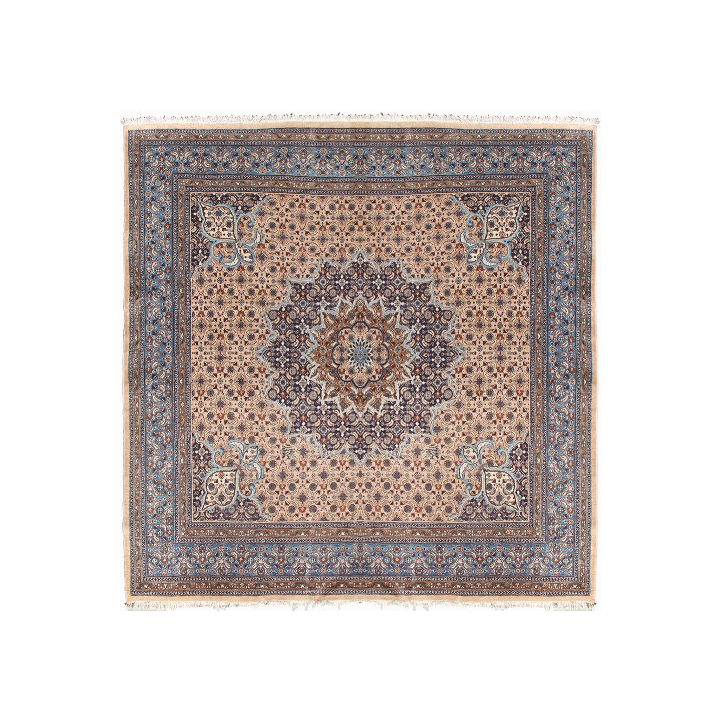 Featuring a rich blue border and soft peach background, this rug exudes timeless elegance and classic Persian craftsmanship. Made from luxury wool, it offers durability while showcasing the intricate, traditional Tabriz design.