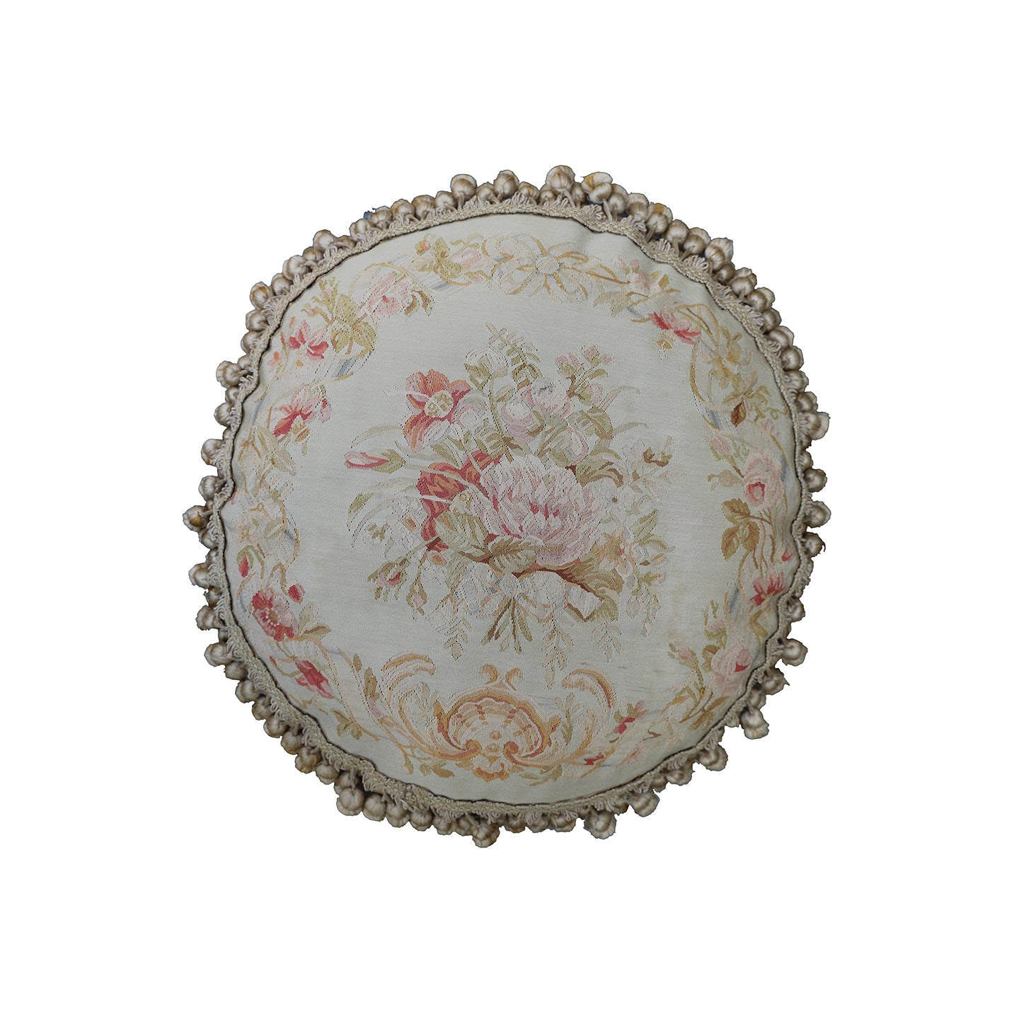 Decorative round pillow with floral pattern and beaded edge on a white background