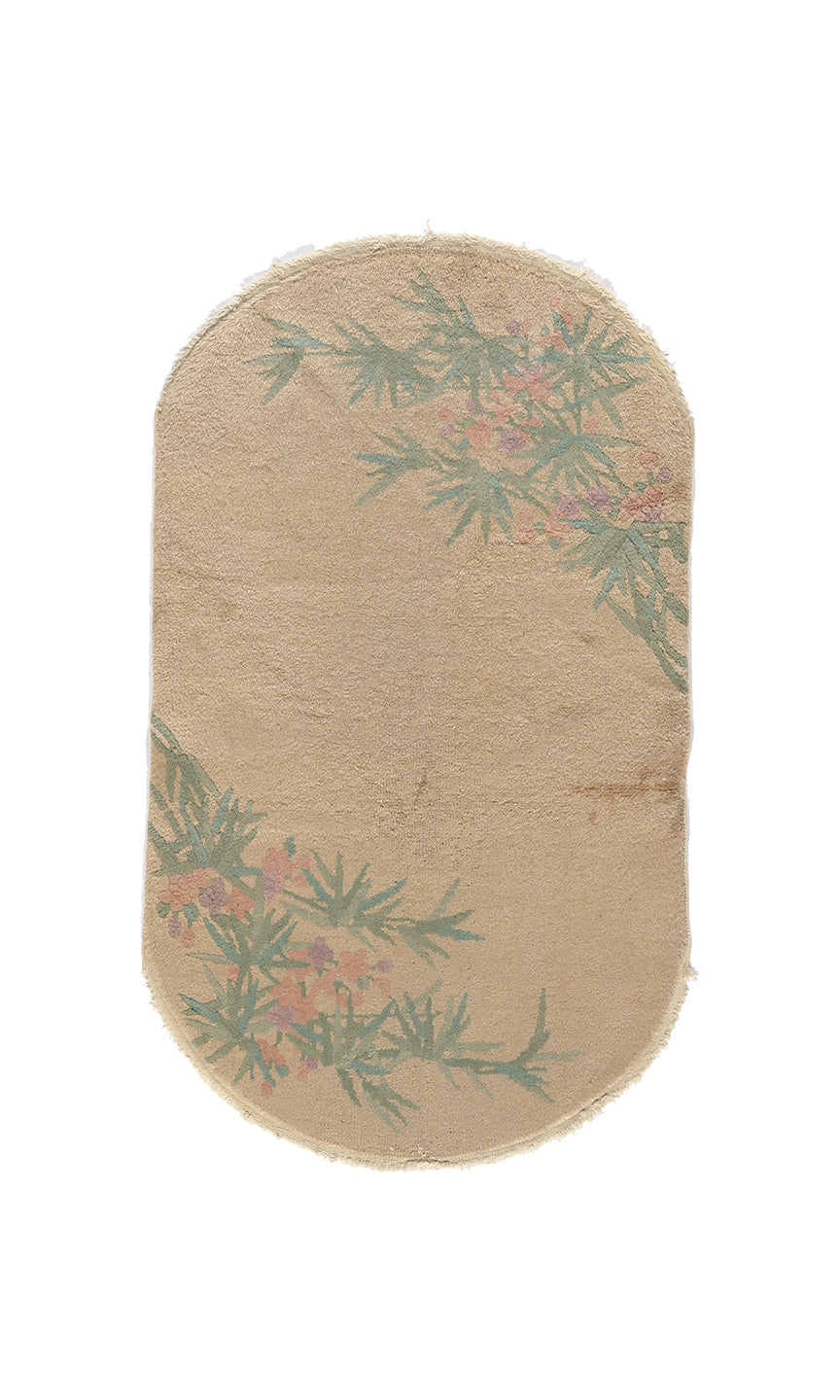 Elevate your living space with our Chinese Art Deco Oval Rug, a masterpiece in beige adorned with graceful green flowers. This hand-knotted rug, crafted from soft wool, offers both elegance and comfort. Its timeless design complements any room in your home, adding a touch of sophistication. Bring beauty and softness to your living space with this exquisite rug.