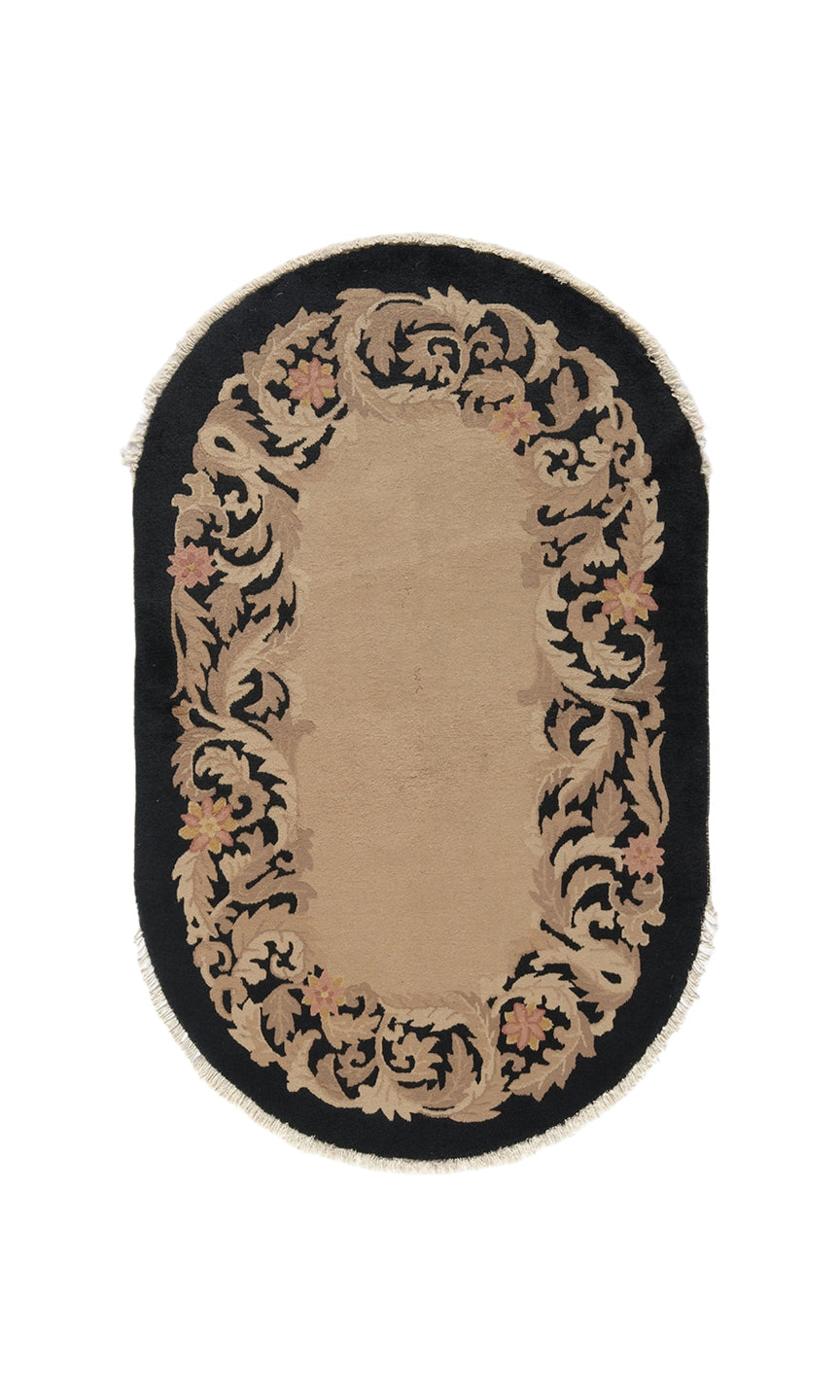 3'x5' Small Oval Black and Beige Chinese Art Deco Rug