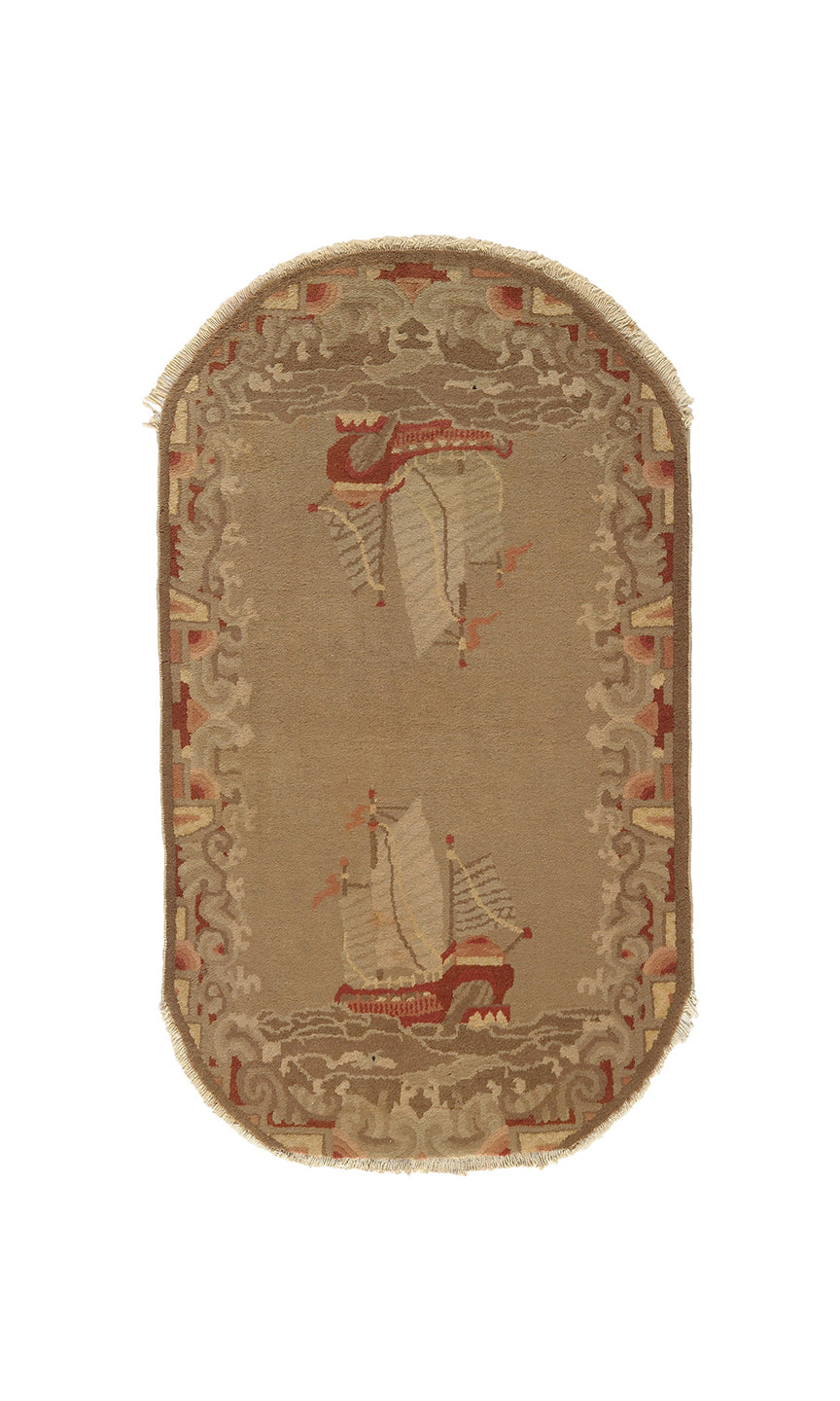3'x5' Small Oval Brown Boat Pictorial Art Deco Wool Rug