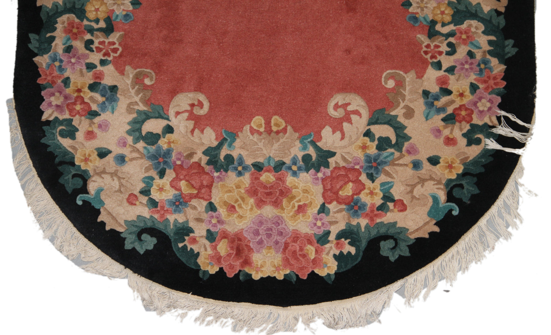 Introducing our Oval Chinese Art Deco Wool Rug, a stunning addition to your home decor. Its vibrant red-orange hue, complemented by a sleek black border, showcases intricate floral designs that add an air of sophistication. Crafted from soft and inviting wool, this rug not only looks beautiful but also feels exquisite to the touch. Its timeless design ensures it complements any room in your home, instantly enhancing the ambiance with a touch of warmth and elegance.