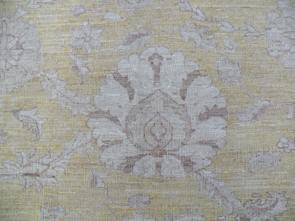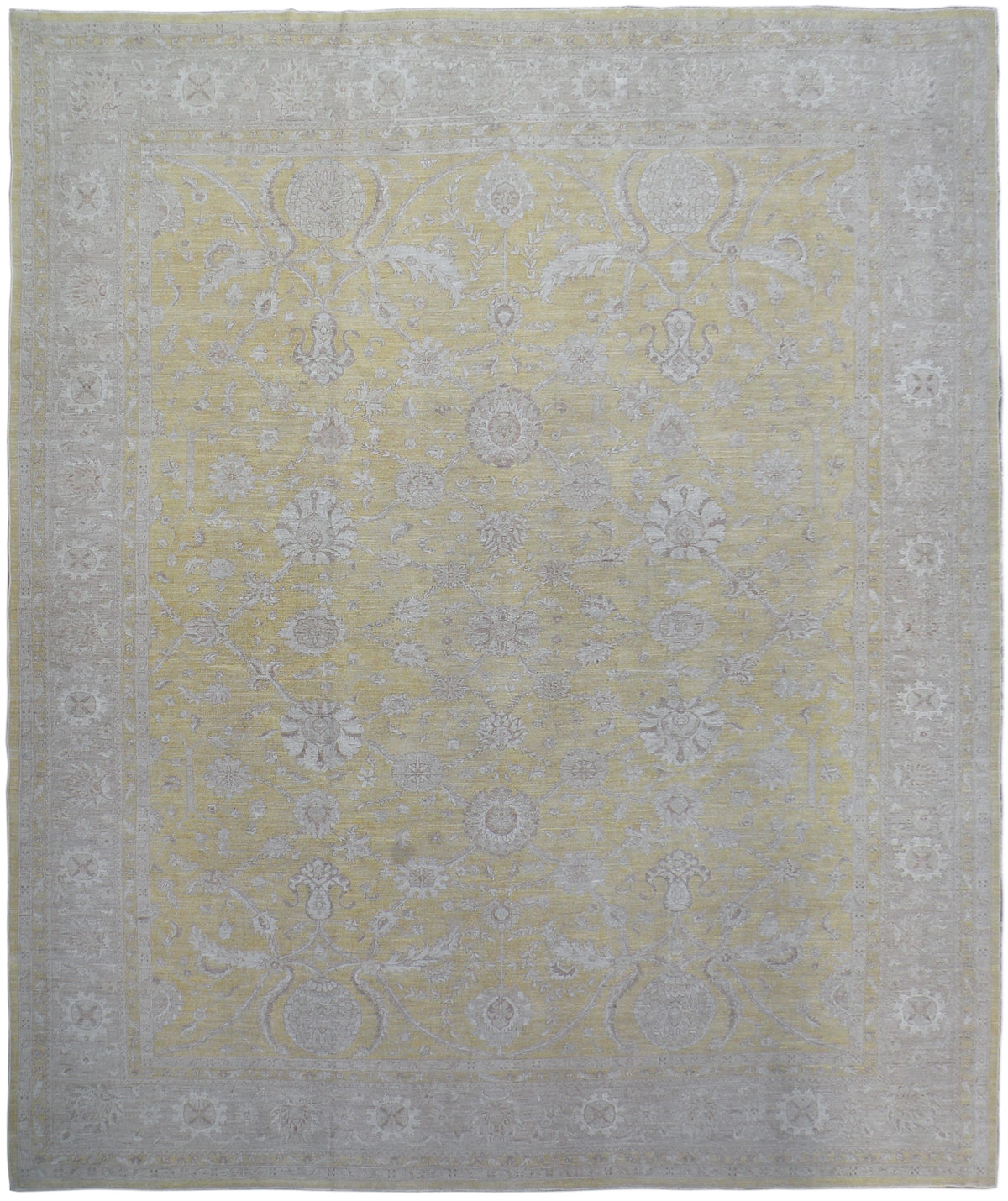 Measuring an impressive 16'11" x 13'10", its radiant canary yellow field creates an immediate sense of luxurious comfort. The sophisticated white and grey palmets, meticulously hand-knotted, add a touch of classic Persian artistry, beautifully blending tradition with a fresh, contemporary feel.