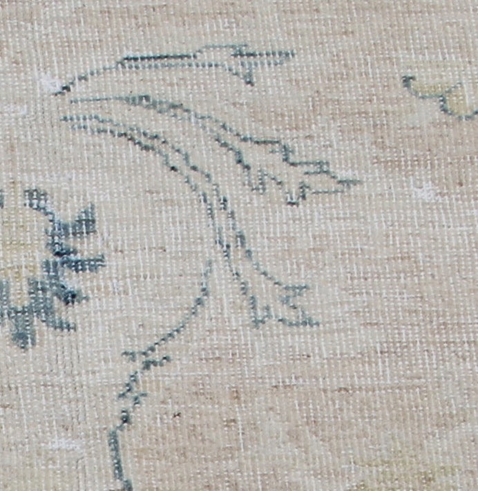 Woven in the heart of Afghanistan by Hazara women artisans, this hand-knotted rug revives the grandeur of the Persian Zigler Mahal design — now softened into a contemporary whisper of its former self. Faded floral motifs in pale brown, ivory, and a powdery blue border bring quiet depth and serenity to any interior.