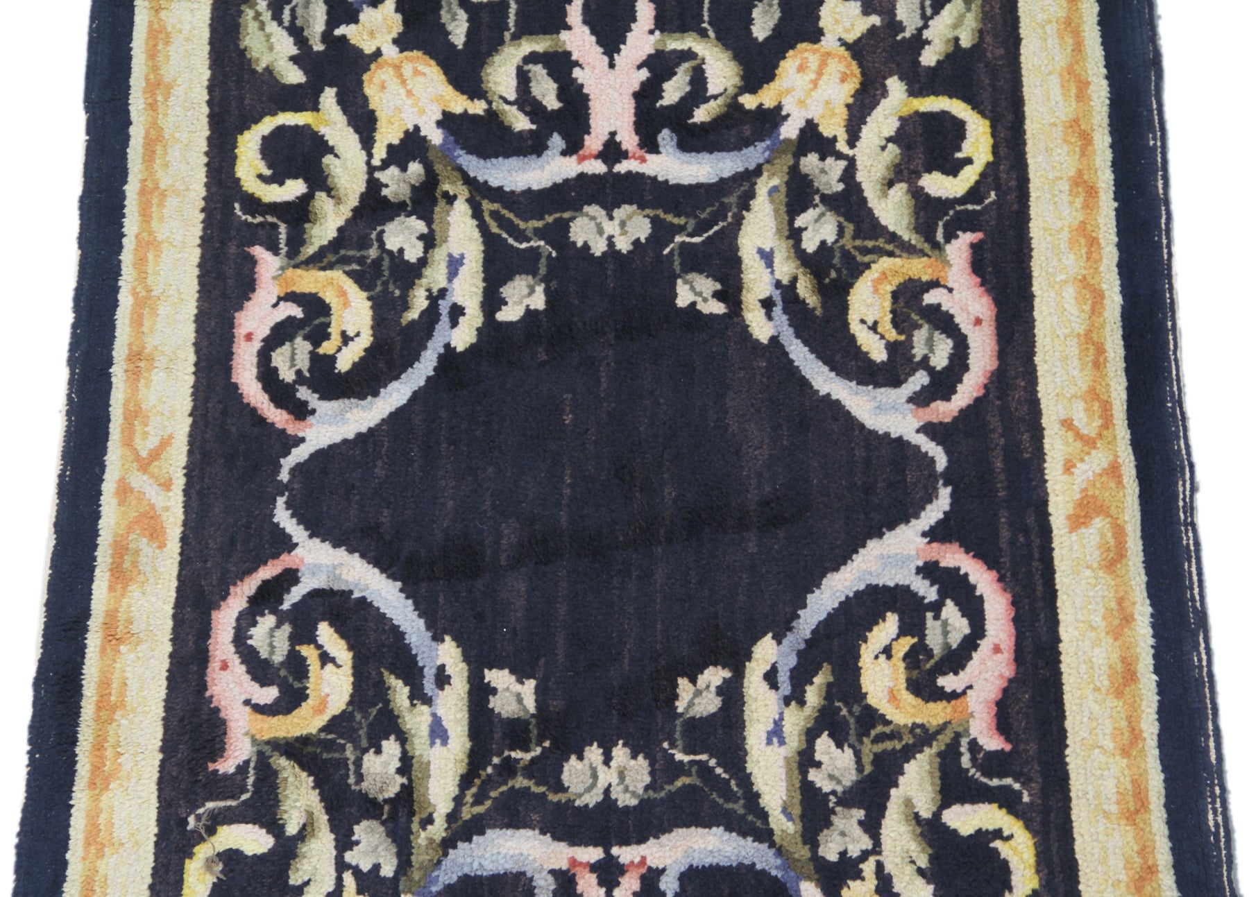 Discover Antique French Savonnerie Rug. Black, Gold, Pink and Blue Colors. Hand-knotted, Wool Runner.