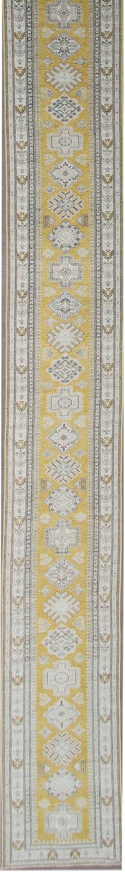 Elevate your hallway or entryway with this luxurious 3'x35' long runner rug from the Ariana Hazara Collection. Expertly crafted with a refined Caucasian geometric design, this piece features a rich, balanced color palette of yellow gold, blue, beige, and ivory, making it perfect for both modern and traditional spaces.