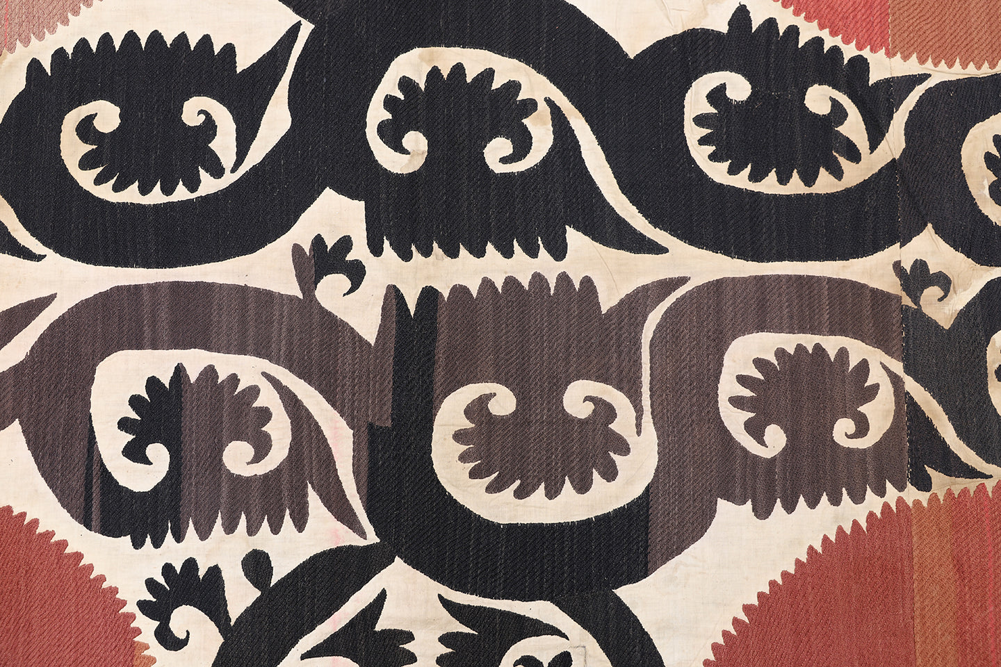This exquisite, large Suzani tapestry showcases intricate hand embroidery, making it a stunning piece for any space. Versatile in its use, this beautiful textile can also serve as a throw cloth or bedspread. If you have a specific design in mind, the tapestry can be custom-cut and resewn into any shape or pattern to meet your vision.