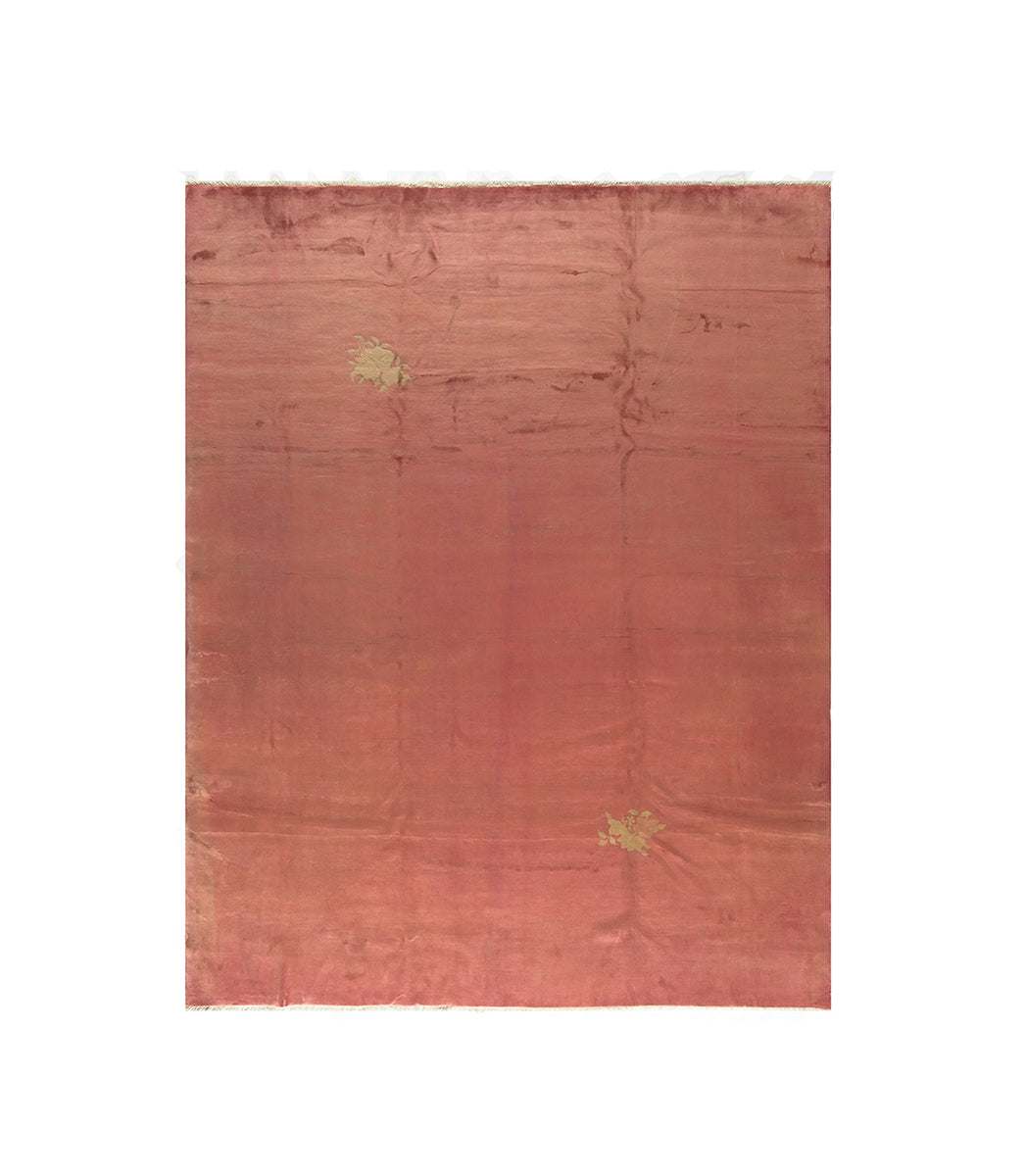 A 1920s hand-knotted masterpiece in solid salmon with elegant floral motifs at opposite corners. Meticulously crafted from premium wool, this rug embodies timeless simplicity and sophistication, making it the perfect addition to elevate your decor.
