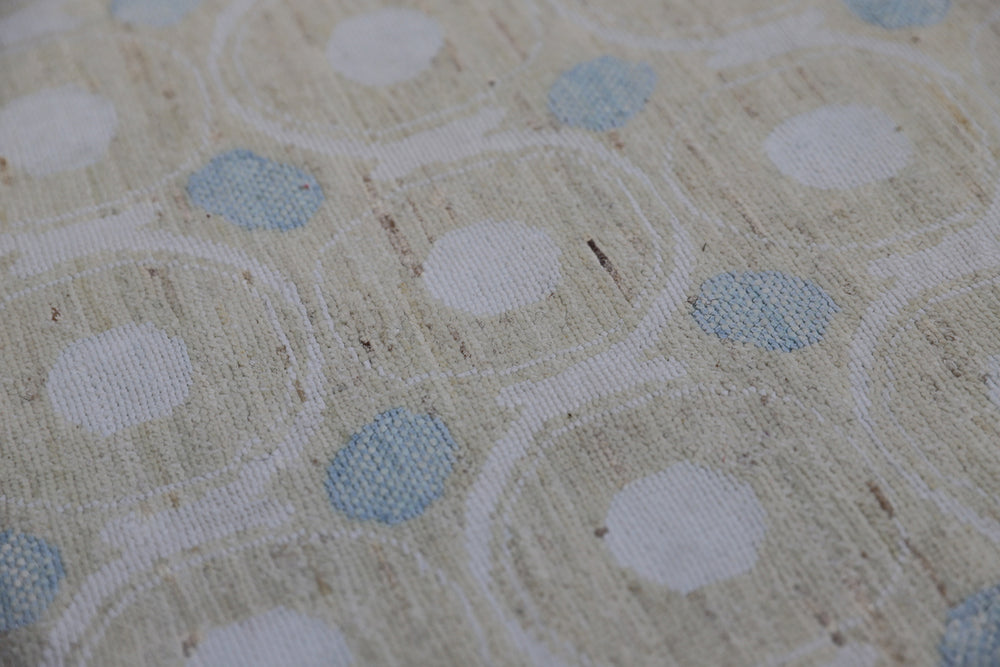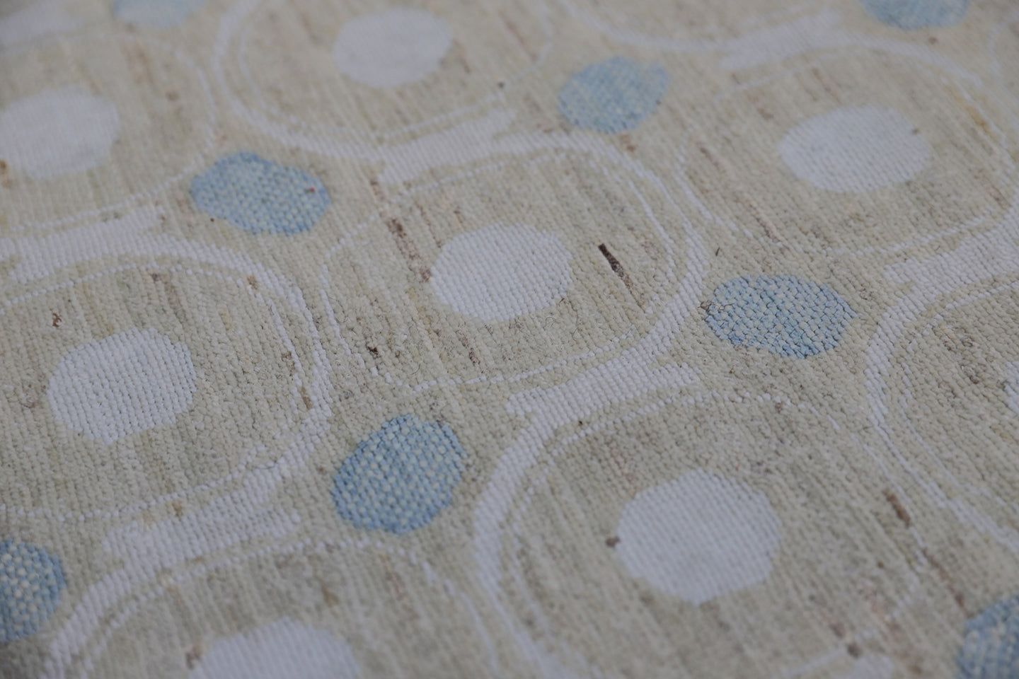 Impressive 16'×20' Ariana rug featuring a modern circular design in soft tan, blue, and white hues. Expertly and very finely hand-knotted, this contemporary masterpiece blends luxurious wool with subtle silk highlights for added depth and sheen. Its grand palace size makes it ideal for expansive living rooms, lobbies, or statement spaces, offering both elegance and artisan craftsmanship.