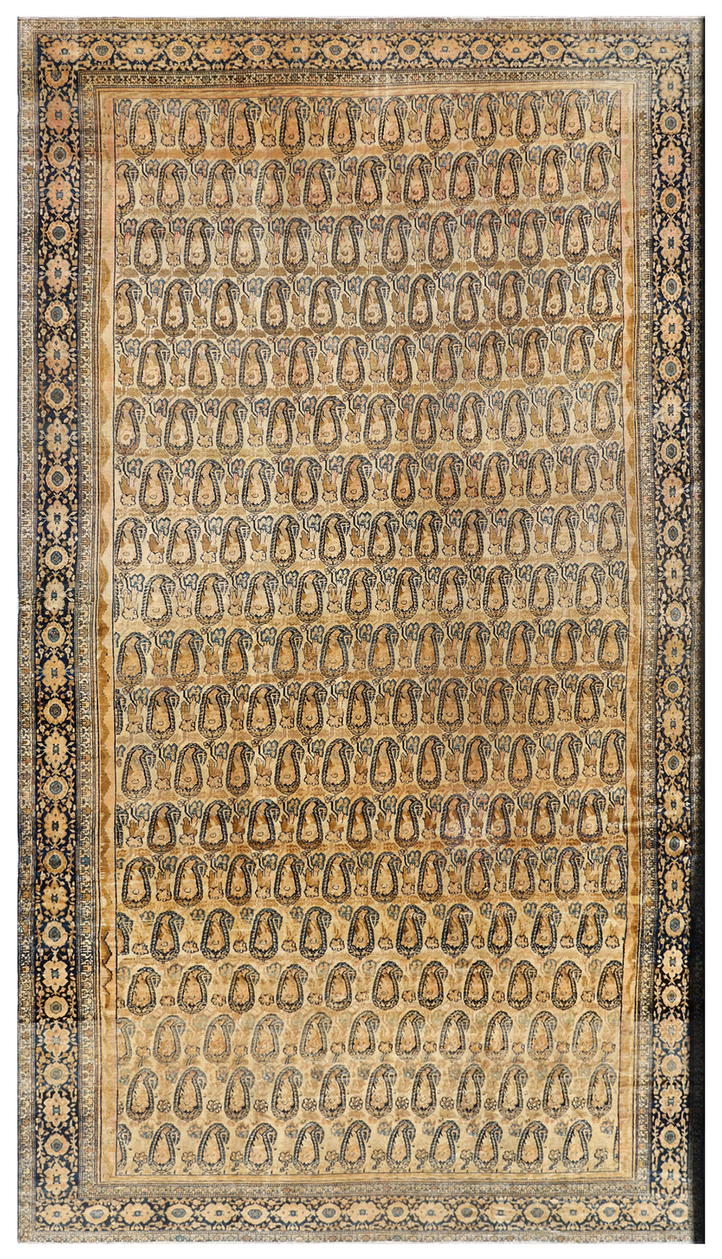 This rare 23' x 12' antique Malayer rug, handwoven in the Hamadan province of Iran, is a masterful example of fine Persian craftsmanship. Created by Persian women using organic hand-spun wool, the rug features an elegant paisley (boteh) design set against a luminous golden-colored field, a hallmark motif celebrated in historic Malayer weaving. The very fine knotting and single-weft construction speak to its superior quality, durability, and artistic precision. Rich natural dyes and time-honored techniques give this rug depth, character, and authenticity, making it a highly desirable collector’s piece and a timeless work of Persian textile art.
