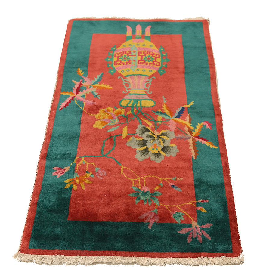 2'x4' Small Red and Green Floral Chinese Art Deco Rug