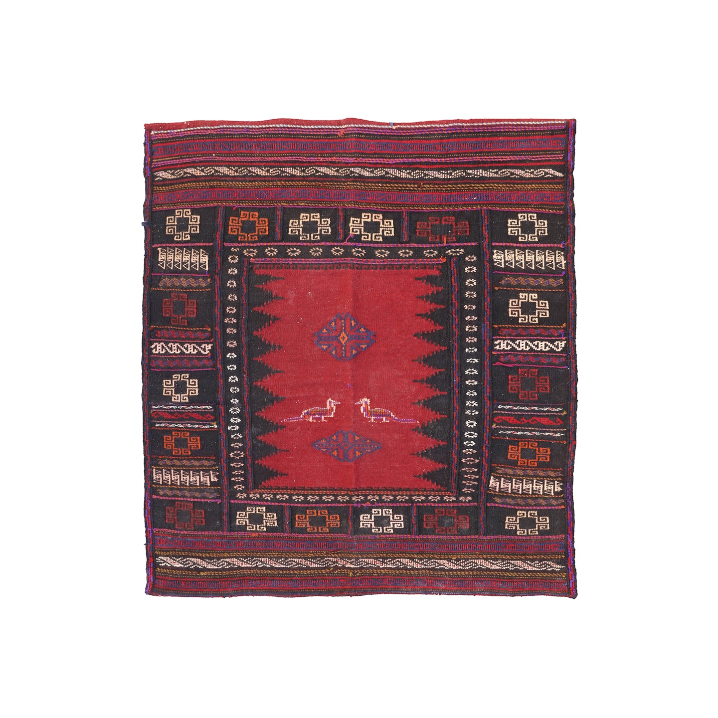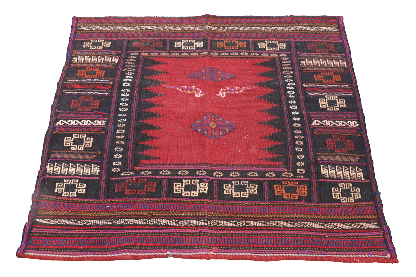 Traditional patterned rug with red and black colors on a white background