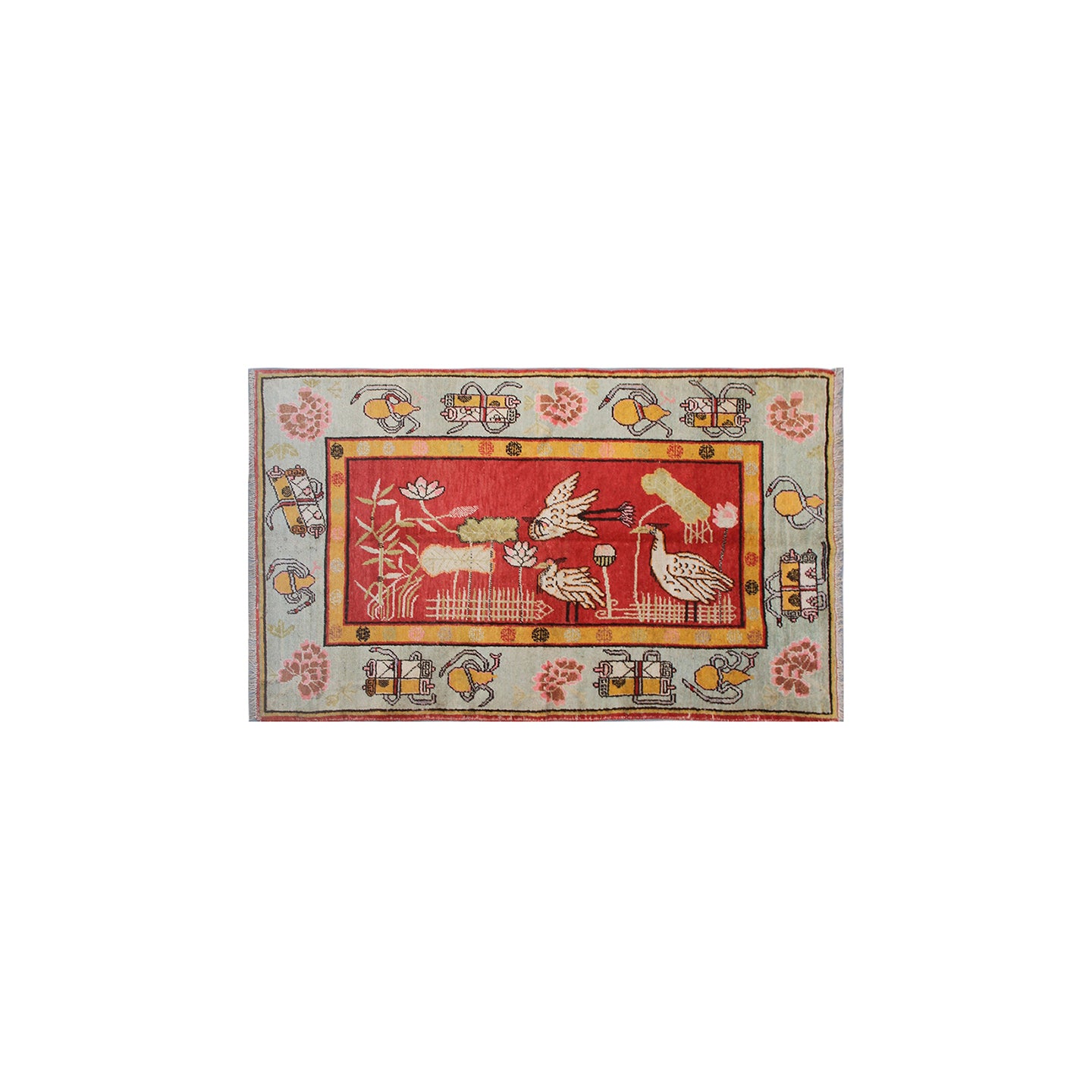 Immerse yourself in the tranquility of this Vintage Yarkand Rug, where three white birds gracefully soar among vibrant flowers and bamboo plants on a rich red background. The scene evokes calm and peace, perfect for any space. The intricate green border, adorned with Chinese scrolls and delicate pink flowers, adds an extra layer of elegance and beauty.