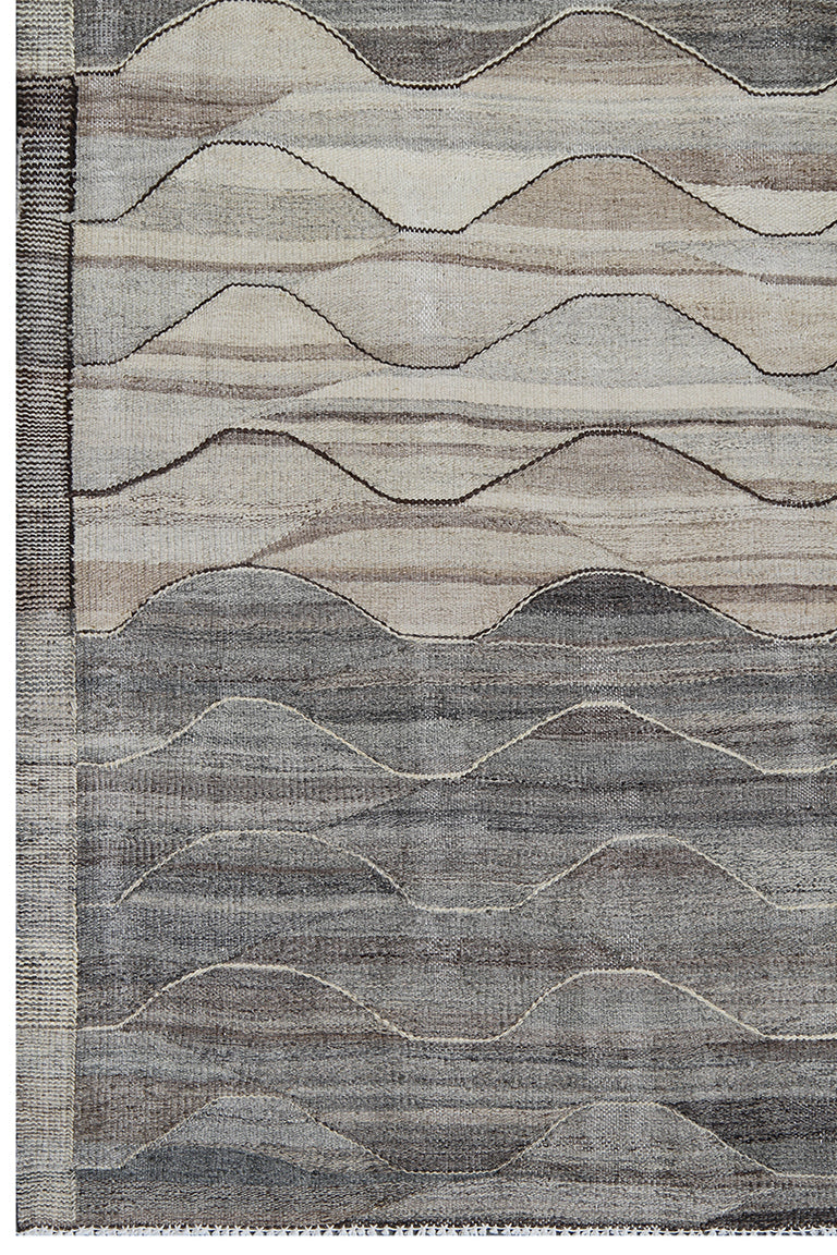 This Ariana Kilim rug features a classic striped design in warm grey and beige, handwoven from high-quality wool on a cotton foundation. Its simple yet elegant pattern makes it versatile for modern, transitional, or traditional interiors. Large and durable, this flatweave kilim is ideal for living rooms, dining rooms, or open spaces, offering both aesthetic appeal and practical functionality.