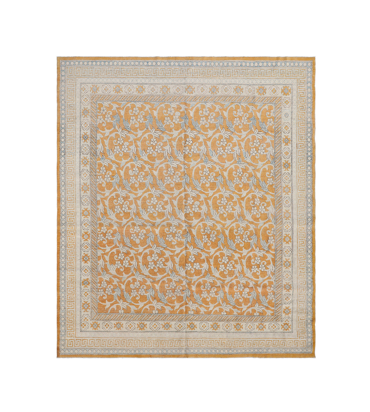Part of our coveted Ariana Samarkand Khotan Collection, this hand-knotted rug brings the bold charm of vintage Central Asian textiles into the present. Its geometric floral field is framed by multiple intricate borders in a vibrant yet balanced palette of ivory, orange gold, soft white, and blue.
